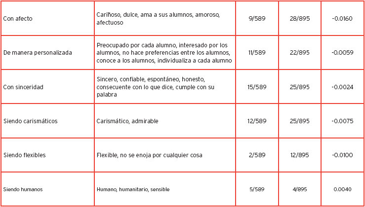 Con respecto a nuestro supuesto de partida: las seis cualidades sobresalientes (explica bien, exigente, paciente, buena persona, claro, comprensivo) de los profesores en general están aún más marcadas en los profesores en Matemática; a partir de la Tabla 9, es posible reconocer indicios a favor en dos de ellas (explica bien con 4.77% y paciente con 3.21%), ligeramente a favor en otras dos (exigente con 0.84% y claro con 0.03%) y en contra en las dos restantes (comprensivo con -0.22% y buena persona con -0.42%).