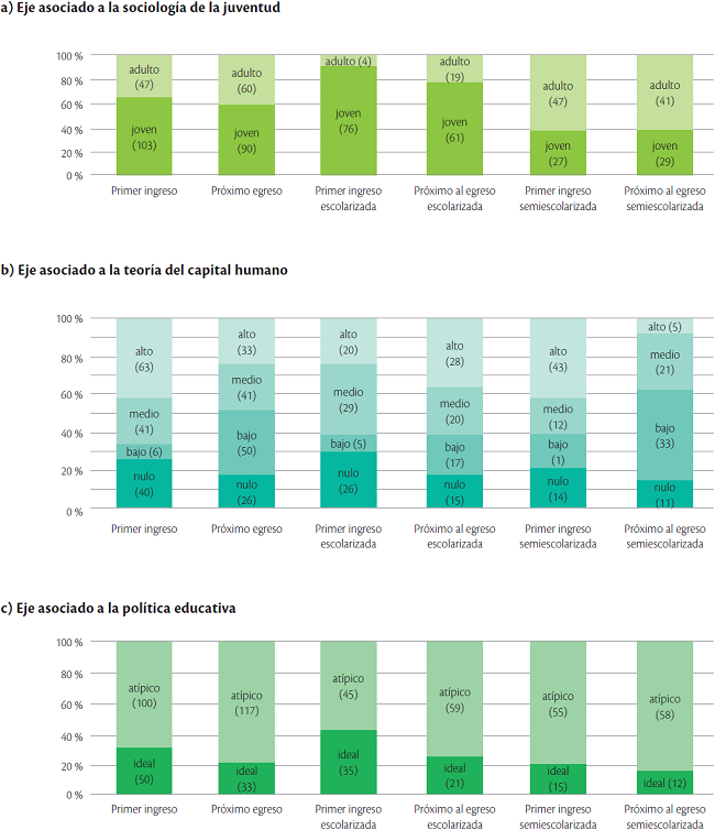Para llevar a cabo el análisis se procedió a la clasificación de los datos obtenidos a partir de los ejes planteados en la metodología, considerando tanto el agregado de estudiantes como diferenciados por su etapa en la trayectoria escolar (nuevo ingreso/próximo al egreso) y la modalidad educativa (escolarizada/semiescolarizada). Lo anterior se llevó a cabo en dos niveles: 1) de manera individual por cada eje considerando la sociología de la juventud, la teoría del capital humano y los supuestos de la política de educación superior, y 2) a partir de la combinación de las salidas de dichos ejes para la construcción de una tipología que explique la relación educación superior-empleo.