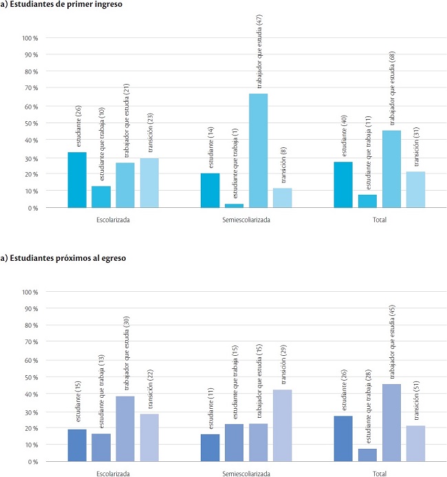 Como ya se anticipaba, el estudiante universitario no puede ser concebido como un tipo único. En este caso la clasificación propuesta evidencia que el estudiante ideal es cada vez menos representativo, inclusive al ingreso. Al respecto, se destaca que contrario a lo esperado existe un gran número de estudiantes que ingresan a la universidad con un empleo. Esto en principio rompe dos supuestos. El primero, más tradicional, de que el estudio superior y el empleo son secuenciales y mutuamente excluyentes; mientras que el segundo de carácter más emergente, sugiere la combinación del estudio y el trabajo como algo positivo, aunque implícitamente se aborda como el estudiante que se incorpora al trabajo y no tanto como el trabajador que se incorpora a los estudios superiores. En este caso la modalidad educativa fue una variable que diferencia claramente dos grupos de estudiantes.