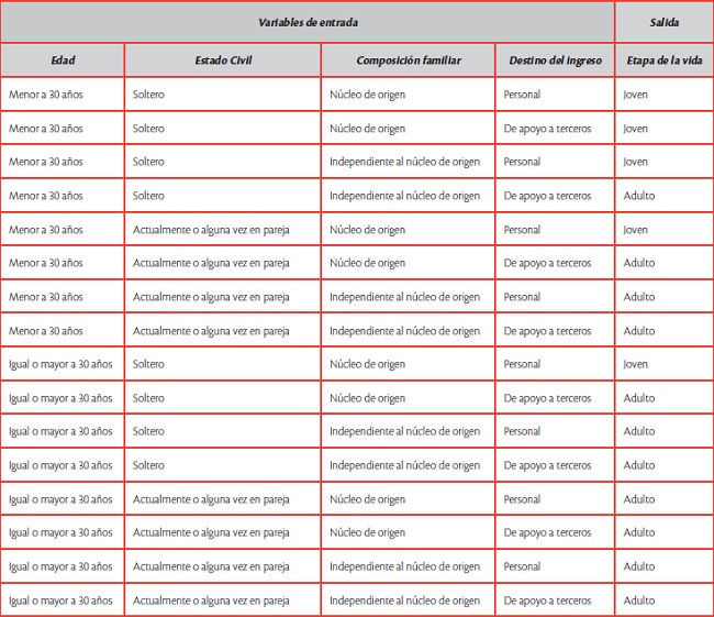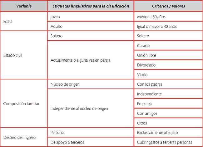 No obstante, la propia sociología de la juventud refiere que la juventud no es per se un estado claramente definido que se alcanza y supera en momentos determinados de la vida. Por el contrario, tiene que ser entendida como una condición social compleja la cual está integrada por una serie de elementos psicosociales que van más allá de la edad (Brito, 1998). Casal et al. (2006) profundizan al referir que la juventud se entiende como un proceso que busca concretar la emancipación familiar y profesional a través de la búsqueda de independencia de la familia de origen para obtener un mayor grado de autonomía en la toma de decisiones. Esto tiene como consecuencia un cambio en el rol que juegan los individuos en términos de dependencia y atribuciones. Con base en lo anterior, las variables propuestas para la construcción de este eje analítico están conformadas por: edad, estado civil, composición familiar y el destino principal de los ingresos. En la Tabla 1 se muestran dichas variables y los criterios de clasificación empleados para la valoración.