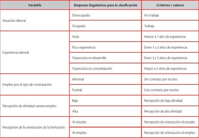 Para esta aplicación se diseñaron tablas de verdad en dos niveles de análisis. La primera con relación a elementos asociables a tres aspectos identificados en la literatura que forman parte del estudio de las trayectorias laborales de los universitarios: la sociología de la juventud, la teoría del capital humano y los supuestos implícitos de la política educativa de nivel superior. El segundo nivel se refirió a la combinación de las salidas individuales como insumos para una nueva tabla de verdad en la que se definió una tipología compleja sobre la relación de educación superior-empleo desde la perspectiva de los estudiantes.