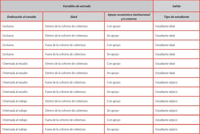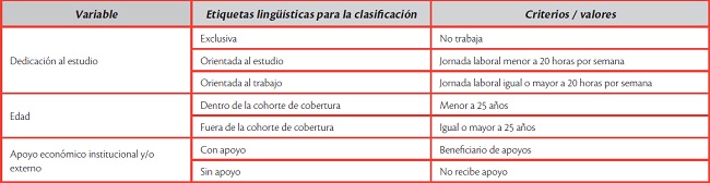 Finalmente, se consideran los apoyos económicos destinados a la manutención de los estudiantes que en esencia tienen como objetivo un mayor aprovechamiento académico. Puede incluir entre otras becas, pasantías, ayudantías de investigación provenientes de la propia institución o de cualquier otra fuente pública o privada. En la Tabla 3 se muestra un resumen de las variables empleadas y su clasificación. Asimismo, en el Anexo 3 se muestran las tablas de verdad correspondientes.