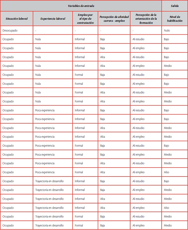 Por lo anterior, se propusieron cinco categorías para estimar el grado de habilitación de los estudiantes universitarios. En principio, se diferencian los grupos de estudiantes que se dedican exclusivamente a sus estudios de aquellos que están insertados en el mercado laboral. Una segunda categoría busca develar la experiencia profesional de los estudiantes haciendo una aproximación a la formación específica. Lo anterior podría clarificar o cuestionar uno de los principios más contundentes que supone la teoría del capital humano y que define que los individuos con mayor nivel educativo y mayor experiencia tienden a obtener mayores salarios (Barceinas, Oliver, Raymond y Roig, 2001). Una tercera categoría aborda el tipo de contratación debido a que se considera que el tipo de contrato puede afectar la permanencia del trabajador y por ende la estabilidad y seguridad en el desarrollo de capital humano del individuo (Anaya, 2009; Loyzaga, 2009). Las categorías de afinidad carrera-empleo y orientación de la formación, parten de las conclusiones del trabajo de Salas y Flores (2016b) los cuales encuentran que los estudiantes que laboran en ocupaciones relacionadas con su carrera pueden desarrollar mayor experiencia y madurez en la vida laboral, a diferencia de trabajos sin mucha relación. En la Tabla 2 se muestran los criterios de clasificación de las variables empleadas para la construcción del eje asociado a la teoría del capital humano. De manera similar al eje anterior, la construcción de las tablas de verdad que definen las salidas se muestran en el Anexo 2.