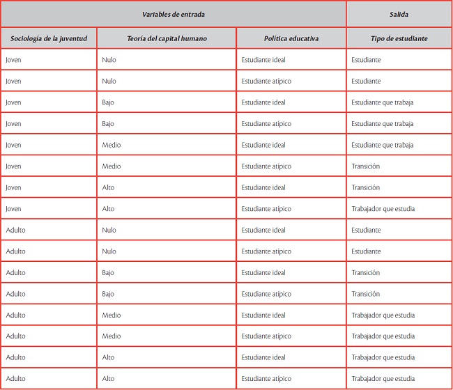 Cabe destacar que la metodología empleada posibilita crear salidas a partir de la combinación de entradas, por lo que operativamente se consideró para algunas salidas la etiqueta lingüística “transición” en casos en los que existían elementos simultáneamente asociables a los grupos de “estudiantes que trabajan” y “trabajadores que estudian”. Esto supone superioridad analítica ya que puede evitarse forzar condiciones que restan capacidad explicativa por la ambigüedad inherente. Mejor aún, esta herramienta hace posible crear grupos entre las fronteras que existen entre rangos haciendo posible la clasificación de la incertidumbre.