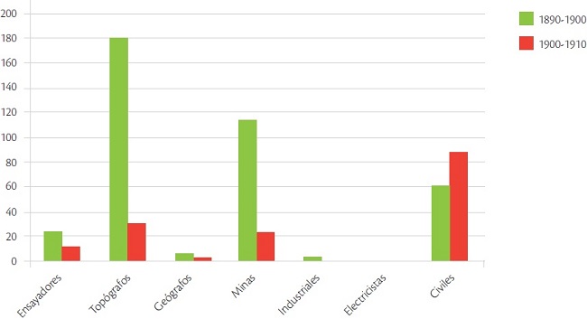 En el Cuadro 1 se observa que, por ser una escuela de minas, de 1792 a 1866, las carreras estaban asociadas a la minería, a la agrimensura y a la geografía. A partir de su transformación en Escuela Especial (luego Nacional) de Ingenieros se incorporaron otras especialidades como la Ingeniería Civil y la Ingeniería Mecánica, y años más tarde la Ingeniería Eléctrica. Para la década de los noventa del siglo XIX era evidente la decadencia de las carreras asociadas a la industria, como se muestra en la Gráfica 1. Poco más o menos a la mitad de la gestión porfiriana, cuando la economía nacional dependía de las inversiones extranjeras principalmente.