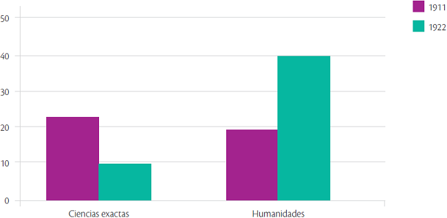 En el proyecto inicial, las ciencias físicas tenían una presencia mayor que las demás, como se evidencia en la Gráfica 3, donde se muestra el número de cursos propuestos en 1911 y 1922 en la ENAE para las secciones de ciencias exactas y humanidades.