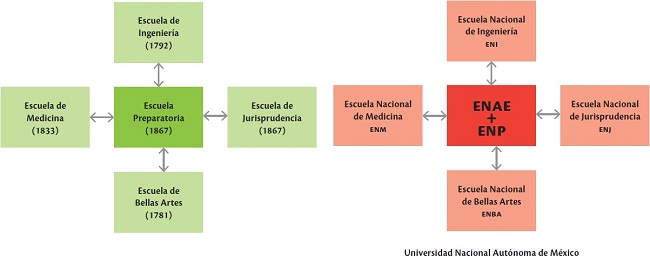 Finalmente, en 1910 se crearon estas dos instituciones como parte de las suntuosas festividades realizadas en torno al centenario de la Independencia del país. El 18 se septiembre de 1910 se fundó la ENAE y cuatro días más tarde la UNM. La Universidad integró las escuelas nacionales que venían funcionando de manera independiente: la ENI desde 1792, la ENAB desde 1781, la ENM desde 1833, la ENJ y la ENP desde 1867, como se muestra en el diagrama 1 (Ruiz, 1967).