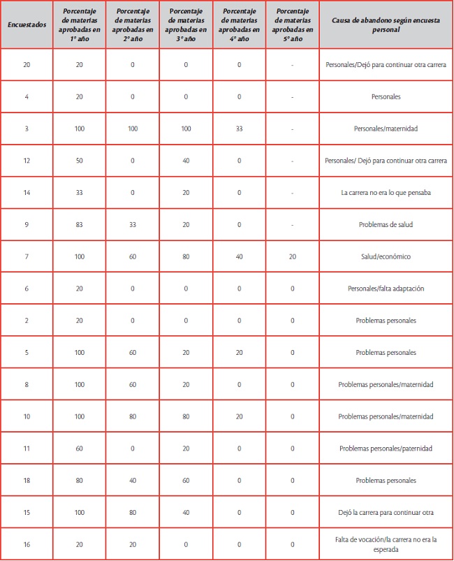 Las respuestas de los encuestados en relación con las causas de su abandono y los datos de su desempeño académico se observan en la Tabla 2.