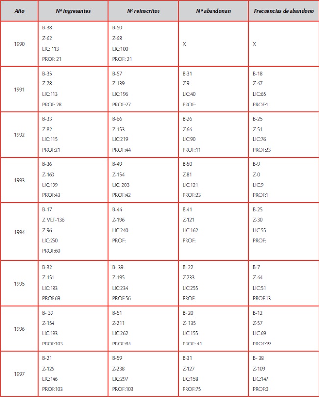 En este trabajo presentamos una primera aproximación a la identificación de los aspectos más relevantes que podrían asociarse con el abandono de las carreras universitarias del profesorado y licenciatura en Ciencias Biológicas durante el periodo 1991-2001 en nuestra Facultad, respecto del cual se cuenta con datos aproximadamente suficientes. Seleccionamos esta década también por la relevancia de las políticas adoptadas en distintos ámbitos educativos con implicancia sobre la vida social. A mediados de los años ochenta se inicia una serie de reformas que repercutirán en todos los ámbitos de la vida social, con un fuerte impacto durante la década de los noventa (Bianchi, 2004). El citado autor, apoyándose en distintos investigadores considera que: “las políticas neoconservadoras han afectado profundamente a la sociedad en general y al sistema educativo en especial, por ser éste parte integrante del entorno social”(Bianchi, 2004: 2). Santos Sharpe (2016) señala que hacia 1984 se produjeron nuevas condiciones institucionales y materiales para el desarrollo de estudios sobre la temática del abandono, ya que se estableció nuevamente el ingreso irrestricto en las universidades y con esto la masificación de las mismas.