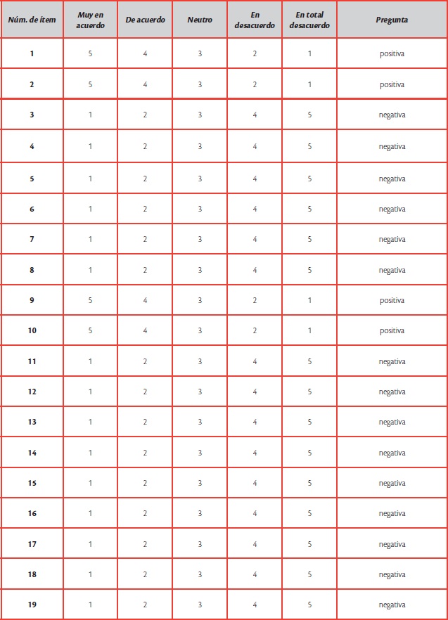 Para el análisis de los datos se utiliza el modelo de estadística descriptiva, teniendo en cuenta variables cuasi cuantitativas u ordinales. A cada valor de respuesta se le asignó un puntaje teniendo en cuenta si los ítems son positivos o negativos. Si el enunciado es positivo, se asigna el valor de 5 a Muy de acuerdo, hasta llegar a 1, Muy en desacuerdo. Si el ítem es negativo, se le asigna 1 a Muy de acuerdo, hasta llegar a 5 a Muy en desacuerdo. Por cada persona que responde, se suma el resultado obtenido y se divide por la cantidad de preguntas, en este caso 19. En nuestro caso: puntaje máximo por obtener: 95/ 19 ítems = 5; puntaje mínimo por obtener: 19/19 ítems = 1.