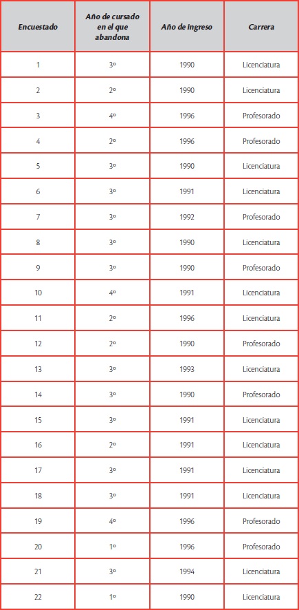 El supuesto inicial para este trabajo fue que el abandono durante la década seleccionada se relacionaría fundamentalmente con razones socioeconómicas más que con las académicas o vocacionales. Si bien el número de encuestados no es representativo en términos del universo en estudio, por lo que no nos permite realizar generalizaciones en todos los casos, sí podría delimitar un escenario que nos ayude a considerar ciertos aspectos que generarían el abandono.