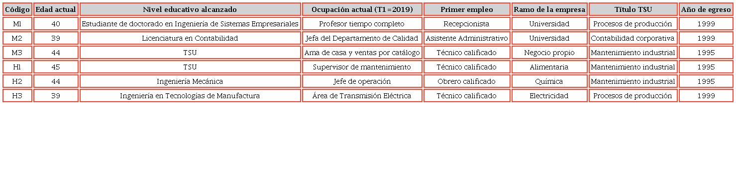 La recolección de la información mediante la encuesta se llevó a cabo durante mayo y junio de 2019. Una vez analizados los datos, se condujo la entrevista de historia de vida entre julio y agosto de 2019. Por la naturaleza del estudio y el tipo de información recolectada, no es posible hacer generalizaciones hacia toda la población de la UTTT y tampoco a la población general de egresados como TSU en México. Este estudio es una primera exploración a los cambios ocurridos en cuanto a educación, ocupación e ingresos en cada uno de los seis egresados estudiados, dentro de un contexto social determinado, por ello, la importancia del caso de estudio específicamente de la Universidad Tecnológica de Tula Tepejí, la cual fue materia del análisis previo y de ahí su selección.4