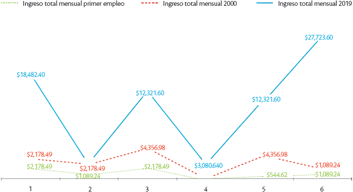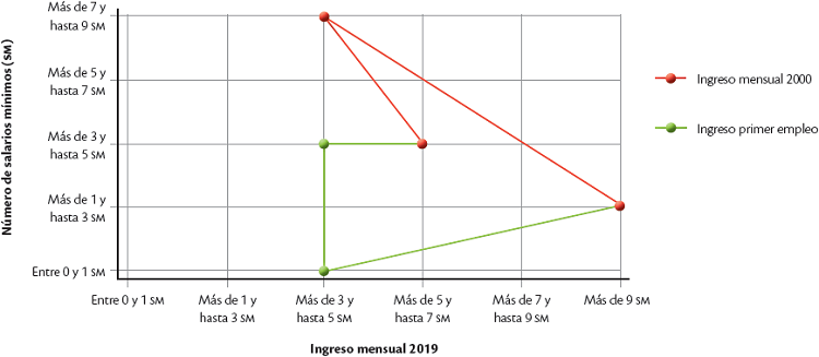 Arriba se sostiene que para ver si el cambio de ocupación se ha traducido en mejores condiciones de vida, había que analizar el ingreso. La Gráfica 1 muestra cómo ha cambiado esta variable en la pequeña muestra de los encuestados en tres momentos: en el primer empleo, empleo en el año 2000 y en el 2019. Como se puede ver, hay un solo punto donde se consideraría que no hay una mejora en el ingreso, sino un retroceso. Esto es cuando el ingreso del 2019 marca de 3 a 5 salarios mínimos y en contraste, para el 2000, éste nivel correspondía a un nivel más alto (7 a 9 salarios mínimos).