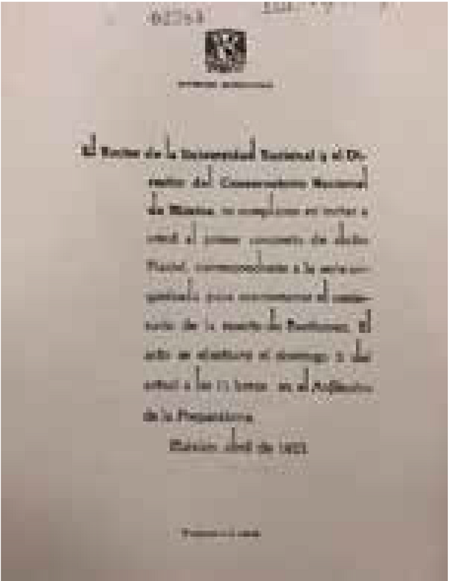 Adjuntas se servirá usted encontrar las bases que para el funcionamiento de la Orquesta Sinfónica de México ha redactado la Rectoría de la Universidad Nacional. De acuerdo con el artículo 4º de las bases, serán miembros del Consejo de la que fue Orquesta Sinfónica Mexicana a quienes el Rector de la Universidad ratifique su nombramiento por medio de una invitación. Tendría un gran placer en que la Orquesta Sinfónica de México pudiera contar con la entusiasta y desinteresada cooperación con que se ha servido usted ayudarla (AHUNAM, FUN, sección DA, c. 42, exp. 1308, f. 15698).