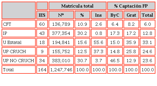 Por su parte, la formación técnico profesional sigue un comportamiento peculiar. De los 60 CFT que integran el SIES y que reúnen el 10.9% de la matrícula general, solo seis de ellos adhiere a gratuidad; baja adhesión institucional que no impacta negativamente en el volumen de potenciales beneficiarios que bordea el 48.7%. Este comportamiento de baja adscripción institucional pero alta cobertura proyectada puede explicarse por las diferenciadas y segmentadas características que tiene el estamento técnico profesional en cuanto a presencia territorial y captación de matrícula. Así por ejemplo, el Instituto Nacional de Capacitación (INACAP), mega centro de la formación técnico profesional, concentra por sí solo el 34.9% de la matrícula de este segmento, y alcanza una participación del 74% respecto de los CFT que adhieren a gratuidad.
