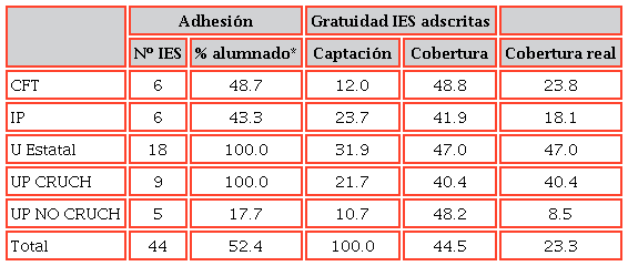 En consecuencia, las restricciones institucionales referentes a acreditación, admisión y lucro actuarían dinámicamente y según la particularidad de cada institución, las cuales definen su estrategia de posicionamiento en un continuo paradigmático que transita entre la educación como derecho social y su concepción como bien de consumo, situación que explica la baja adhesión institucional (26.8%) y cobertura real (23.3%). Pese a esto, la política de gratuidad representa una fuerte responsabilidad económica para el gasto público, acaparando más de un tercio de lo asignado al sistema de educación superior (33.8%).