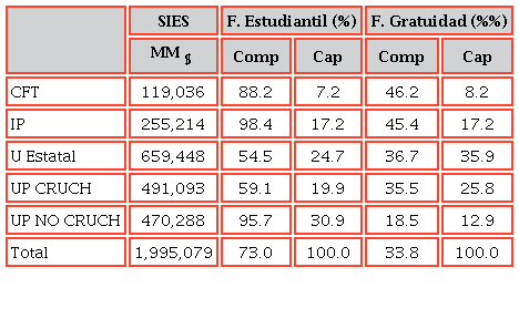 A la presencia de un sistema de educación superior que se expande en términos de cobertura con una matrícula eminentemente universitaria y de carácter privado, se suma como fenómeno reciente el constante incremento en la captación de los fondos públicos por parte de entidades privadas. Las IES del Estado, con las cuales éste comparte misma naturaleza y objetivo, captan un escaso 33.1% del total de financiamiento, porcentaje que en la última década ha experimentado un descenso preocupante. En una política de voucher donde los fondos siguen a los alumnos, el financiamiento público fluye cada vez con mayor intensidad hacia instituciones de naturaleza privada, tendencia que se vio acentuada con la entrada en vigencia de la política de gratuidad.