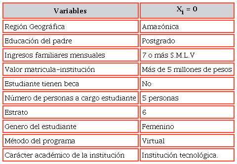 En la Tabla 6 se observa la probabilidad de obtener una puntuación menor o igual a la media dependiendo de que Xi=1 o si Xi=0. Para valores de Xi =0, se calculó la probabilidad que el estudiante tenga una puntuación menor o igual a la media, esto es: si el estudiante es de la región Amazónica; educación del padre con posgrados; ingreso familiar mensual 7 sml o más; valor de la matrícula 5 millones de pesos o más; sin beca; con cinco o más personas a cargo; estrato 6; mujer; programa de carácter virtual e institución tecnológica; la probabilidad es de 0.208. Pero si mantenemos todas las características iguales y bajamos a cero el número de personas a cargo la probabilidad baja, es de 0.061. Luego, en este grupo de estudiantes es probable que tengan puntación superior a la media y entre menor número de personas a cargo, menor probabilidad de estar por debajo de la media.
