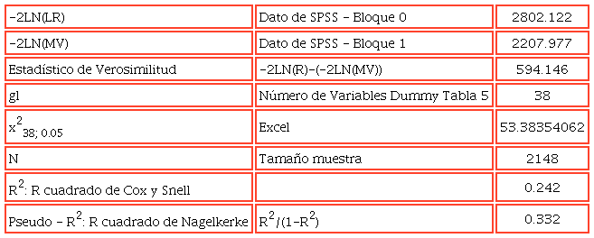Los valores de R2 = 24.2% y Pseudo - R2 = 33.2% aparentemente son bajos, y llevaría a pensar que la capacidad explicativa del modelo no es buena, pero de acuerdo con Morrison (1972), citado por Salas (1996), cuando las correlaciones se dan entre una variable dependiente binaria y se trata de modelos con variables cualitativas (dicotómicas o categóricas), que es el caso de esta investigación, para este tipo de variables es aceptable obtener estos resultados.