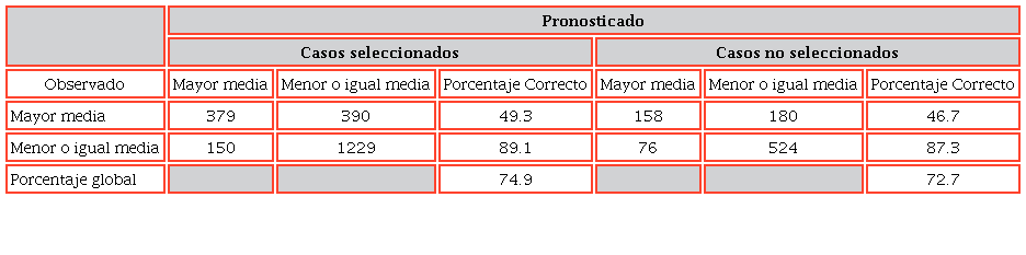 Este modelo presenta un 89.1% (es decir, 1229/1379 100) de probabilidad de clasificar correctamente los puntajes menores o iguales a la media, es de decir, de sensibilidad y un 49.3% (es decir, 379/769 100) de probabilidad de clasificar correctamente los puntajes mayores a la media, es decir, de especificidad y clasifica correctamente el 74.9% ((379+1229)/2148*100) de los 2148 casos seleccionados y se valida en un muestra de 938 datos, donde muestra una sensibilidad del 87.3% y una especificidad del 46.7%, con un 73% de datos del total, bien clasificados.