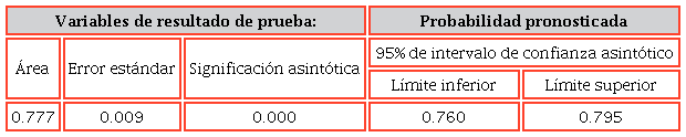 El criterio que se asume para el área bajo la curva es, si [0.5; 0.6] el modelo es malo; [ 0.6; 0.75] es regular; [0.75; 0.90] es bueno; [0.90; 0.97] es muy bueno; [0.97; 1] es excelente. En este caso el modelo presenta un área del 76% al 80% de intervalo de confianza con un 95% de confianza, luego es bueno el modelo para clasificar (ver Tabla 4).