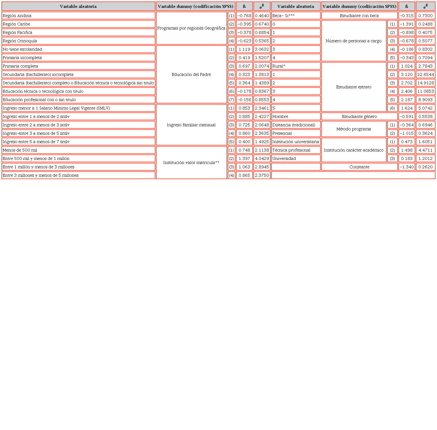 Con el apoyo del SPSS 24 se realizó la codificación y definición de las variables dummy; es importante tener presente la categoría de referencia definida por cada variable. Si el SPSS no dispone de otra cosa, asume como referencia el último código; así se hizo en esta investigación excepto para género; tener beca; método del programa, carácter académico de la institución (ver Tabla 1).