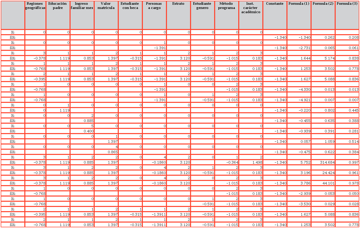 A continuación se analiza la fuerza, sentido y significación de los coeficientes (β) y sus OR (eβ), y estadístico de prueba. Observando los OR de cada variable independiente, hay un grupo de variables con valores mayores a 1, lo que indica que hay una relación directa entre la variable dependiente y la independiente; ellas son: ingresos familiares; valor de la matrícula; carácter académico de la institución; estrato y educación del padre, que va desde no tener escolaridad a tener máximo educación técnica o tecnológica sin título. Para los OR con valores menores a 1, indica que hay una relación inversa, las variables son: estudiante con beca; número de personas a cargo; método del programa; género; regiones geográficas del programa; educación del padre con educación técnica o tecnológica con título, o profesional con o sin título y número de personas a cargo (Tabla 5).