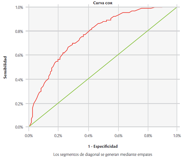 Se determina el punto de corte (ver Gráfica 1), es decir, donde se encuentra la pendiente de la curva, donde la especificidad y la sensibilidad toman sus máximos valores y encontramos el mayor porcentaje de puntajes menor e igual a la media y puntajes mayores a la media mejor clasificados; éste es 0.67086. Este valor se obtuvo de las coordenadas de la curva suministrada por el SPSS; corresponde a una sensibilidad del 69.1% y una especificidad del 71.8%.