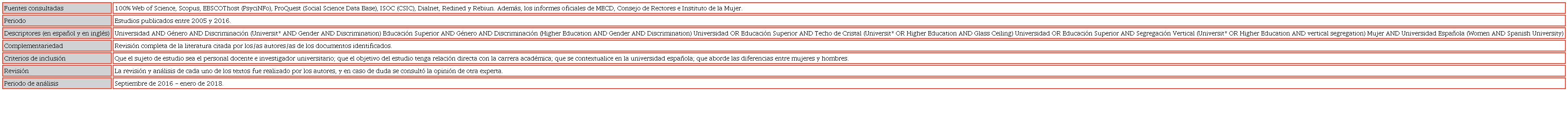 Las palabras género y mujer, utilizadas como descriptores, pueden generar una gran cantidad de información que no se encuentra relacionada con nuestro campo de estudio. Para que fuera lo más productiva posible, las siguientes palabras claves han sido combinadas en diversas ecuaciones de búsqueda, tanto en español como en inglés: universidad (española), educación superior, techo de cristal, segregación, vertical, discriminación, género y mujer.