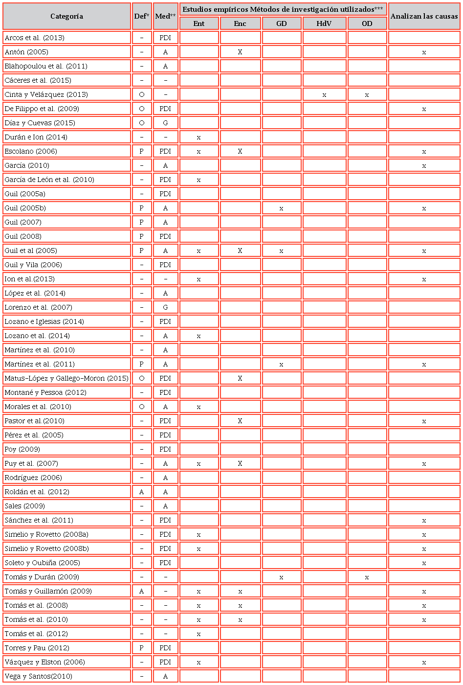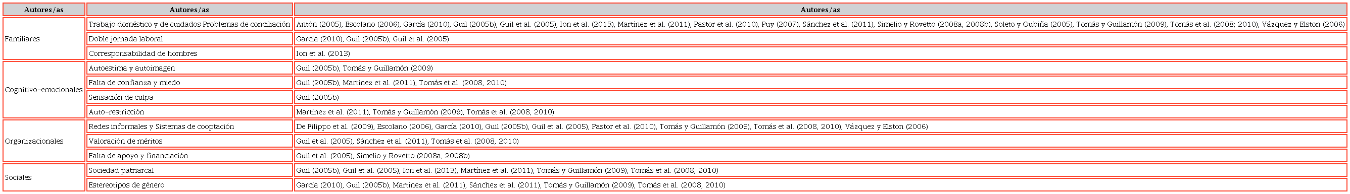 La mayor parte de los estudios no realizaron un proceso de causa-hipótesis-contrastación que fuera más allá de la descripción de las estadísticas oficiales. No obstante, ello no impide que citen o categoricen barreras. La tendencia general por parte de los/ as autores/as consiste en señalar de manera aislada dos o tres barreras que son coincidentes en algunos casos y, en otros no, con los resultados de las otras investigaciones. Cuando se han intentado agrupar estas causas, las categorías más utilizadas han sido la de barreras internas y externas (Tomás y Guillamón, 2009; Tomás et al., 2008, 2010), personales y/o familiares, organizacionales y sociales (Guil, 2005b) y barreras del sistema, del grupo y personales (Puy, 2007). En el presente trabajo, con el objetivo de abordar las causas señaladas en la literatura, se han agrupados estas en cuatro categorías: familiares, cognitivo-emocionales, organizacionales y sociales, relacionándolas con los estudios analizados (Tabla 5).