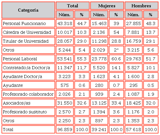 La distribución por categoría es el resultado de varios cambios de normativas y formas de contratación. La última, a partir de 2001, cuando se creó la Agencia Nacional de Evaluación de la Calidad y Acreditación (ANECA) y reguló un proceso de acreditación en cuatro categorías. Dos de ellas, como funcionariado público: cátedra y titular de universidad, y otras dos con contrato laboral: ayudante doctor/a y contratado/a doctor/a. A estas últimas se unen la de profesorado ayudante, concebida para profesorado en proceso de formación, la cual no requiere el título de doctor/a.1