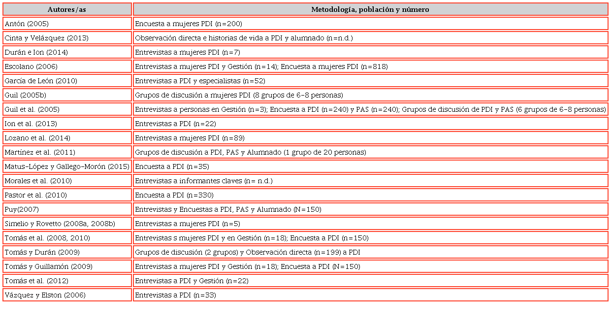 Se realizó una investigación secundaria a partir de documentos primarios, consistente en la revisión de los estudios e investigaciones sobre el techo de cristal en las universidades españolas, publicados en el periodo 2005-2016 (Tabla 1). Se procuró realizar la revisión de la manera más sistemática y rigurosa posible, evitando sesgos subjetivos.