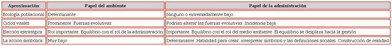 En trabajos que datan de la segunda mitad del siglo XX hasta la actualidad, es evidente la coexistencia de dos tendencias: una línea de investigación que hace énfasis en la adaptación de la organización a las contingencias ambientales (March y Simon, 1977, 1958) y otra línea que propone el paradigma de la ecología de poblaciones, en el entendido de la adaptación como un proceso lento de reacción a los cambios del ambiente (Hannan y Freeman, 1984).