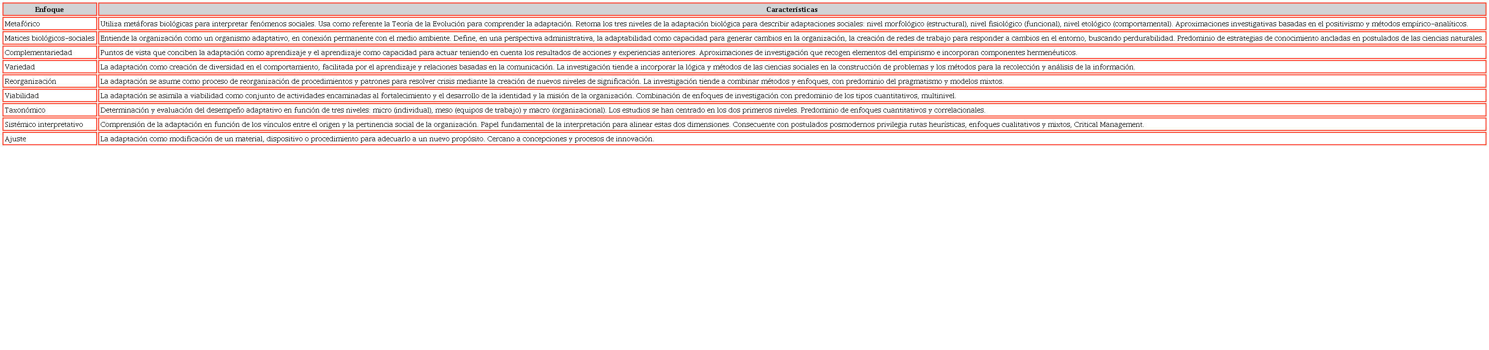 La revisión también ha permitido corroborar que, aunque se asume como deseable y necesario que las instituciones se adapten, no se parte de referentes teóricos claros desde los cuales se asignen responsabilidades y se diseñen estrategias, sino que, con frecuencia, la adaptación se asume como una definición, más o menos amplia, vinculada a gestión del cambio, manejo de conflictos y casi exclusivamente con el propósito de dar respuesta a las demandas del entorno. Además, se identifica que muchas de las definiciones carecen de un sustento sólido epistemológico, por lo que no se observa la conexión lógica entre conceptos que nutren una teoría.