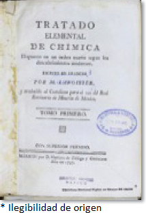 Antoine Laurent Lavoissier [1743-1794] (1797), Tratado elemental de chimica: dispuesto en un orden nuevo según los descubrimientos modernos, escrito en francés por M. Lavoissier, y traducido al Castellano para el uso del Real Seminario de Minería de Mexico, Mexico, Mariano de Zúñiga y Ontiveros, 2 vs. (RSM 1797 MALAV, BN).