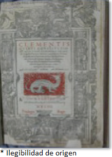 Iglesia Católica Papa [1305-1314: Clemens V] (1554), Clementis Qvinti Constitvtiones qvas vvlgo Clementinas vocant/Aegidio Perrino fideliter emendatae, glossis, argumentis, annotationibus, iurispatronatus arbore, & Ioannis Imolae, Ancharani, Zabarellae, Barbatiae, Panormitani, aliorúmque doctorum commentaris elucidiores redditae, Lvgdvni, Ad Salamandrae, apud Sennetonios Frates (RFO 94-43937, BN).