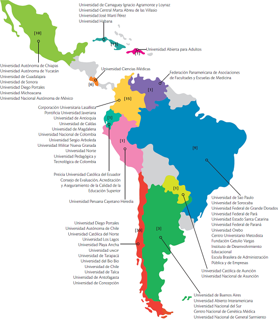 El área geográfica que presenta un marcado liderazgo es América, con 172 publicaciones, teniendo el mayor aporte a nivel de país, Estados Unidos, con 67 publicaciones a través de la participación de 38 universidades, especialmente con los aportes de la Universidad de Harvard, la Universidad de California y la Universidad de Washington. En Latinoamérica se encontraron 60 universidades con 98 artículos sobre acreditación de la calidad de la educación superior. Se destaca Chile con 33 publicaciones en 12 IES de las 53 existentes, sobresaliendo de manera especial las universidades de Tarapacá de Arica, Chile y Pontificia Universidad Católica de Chile que aportan el análisis más exhaustivo en relación con los efectos en el país y la región. Colombia, con 15 artículos publicados en 10 IES de las 289 existentes; se destacan la Universidad Nacional de Colombia, la Universidad de Antioquia y la Universidad del Norte. Sorprende Cuba con 13 publicaciones y cuatro universidades de 21 existentes; México con 10 artículos en siete de 430 IES y Brasil con 9 publicaciones en 11 de 366 universidades. Se notó un escaso desarrollo de la investigación en el tema en países como Ecuador, Venezuela, Bolivia y Perú, entre otros.