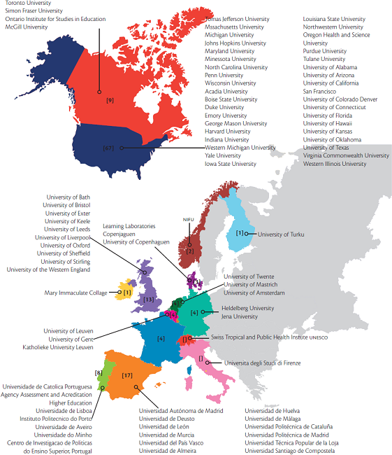 En Europa, sobresalen España y el Reino Unido con 17 y 13 publicaciones respectivamente. En España, están la Universidad Politécnica de Madrid y la Universidad Autónoma de Barcelona. Por su parte, en Reino Unido se destacan la Universidad de Oxford, Imperial College London y la Universidad de Birmingham. Portugal presenta ocho publicaciones provenientes de seis universidades. Llama la atención encontrar institutos o agencias dedicadas al estudio del aseguramiento de acreditación de la educación superior como The Learning laboratories Copenhaguen (Dinamarca), The Ontario Institute for Studies in Education (Canadá), La Agencia de Aseguramiento de Acreditación de la Educación Superior (España), el Centro de Investigação de Políticas do Ensino Superior (Portugal) y la UNESCO (Francia).