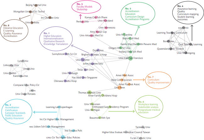 Las ocho comunidades académicas que se han venido consolidando pueden describirse así: la Comunidad 1 expuso el liderazgo de la Universidad de Toronto por contar la mayor cantidad de artículos publicados y su relación de coautoría se establece con las universidades Duke, Johns Hopkins, Oklahoma, Pittsburgh y Texas, en temas de educación superior, la internacionalización en el marco de la acreditación, la calidad de la investigación y traducción del conocimiento. La Comunidad 2, liderada por el CIPES, ha establecido lazos académicos estrechos con las universidades de Twente, Católica Portuguesa, Bath y Copenhague para el tratamiento de temas de aseguramiento de la calidad, la administración de la educación pública, los estándares y normas europeas, y los procesos de acreditación y certificación de la calidad.