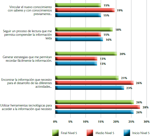 Al observar la figura, se aprecia que el factor de mayor afectación a las posibilidades de adaptación de los estudiantes virtuales a la modalidad tiene que ver con utilizar herramientas tecnológicas para acceder a la información que necesitan (28%), seguido por la posibilidad de encontrar la información que se requiere para el desarrollo de las diferentes actividades académicas (26%), ambos ubicados en el ciclo medio de formación. En el primer caso, se pone de manifiesto que ubicar la información que se requiere es un proceso complejo que va más allá del uso adecuado de una determinada herramienta tecnológica y pasa por conocer dónde buscar; por definir las fuentes válidas en el contexto de la actividad; por la identificación, valoración, selección y uso apropiado de la misma. Esto se ratifica con la dificultad que encuentran los estudiantes a la hora de encontrar la información para el desarrollo de las diferentes actividades académicas, pues más que buscar información en sí misma, se trata de ser capaces de entender lo que pide la tarea, dimensionar su alcance y complejidad, para poder establecer así, en las mismas condiciones, la información pertinente. Vale la pena señalar que, también en el ciclo medio, en tercer nivel de afectación en relación con los ciclos inicial y final, destaca el vincular el nuevo conocimiento con saberes y con conocimientos previamente adquiridos (19%), es decir, el proceso que puede llevar a los estudiantes a generar un aprendizaje significativo. Por otra parte, en el ciclo medio de formación se observa un ligero incremento -con respecto a los demás ciclos- del nivel de importancia que otorgan los estudiantes a la posibilidad de poder generar estrategias que les permitan recordar fácilmente la información y seguir un proceso de lectura que brinde la posibilidad de comprender la información leída.