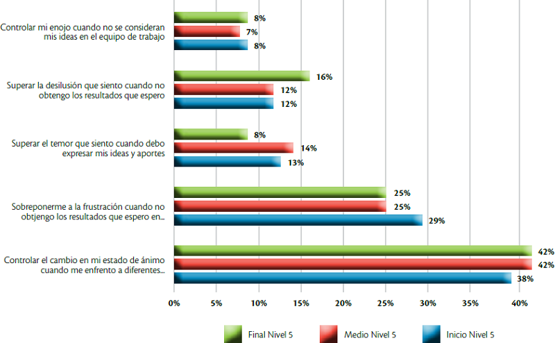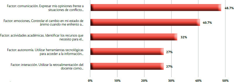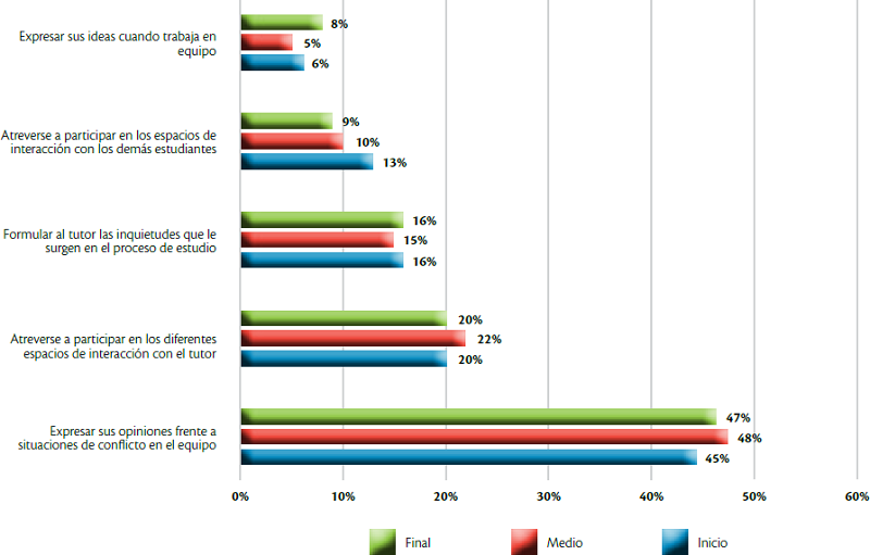 En el contexto de la comunicación, expresar posturas propias cuando se presentan conflictos en el equipo de trabajo (48%), es el factor que se percibe como de mayor impacto; seguido por el poder controlar el cambio en el estado de ánimo cuando se enfrentan diferentes situaciones propias de la educación virtual (40%). Estos datos ponen de manifiesto que, independientemente del ciclo de formación en que se ubique el estudiante virtual, la relación con la tecnología y la interacción con los demás a través de ésta, pueden convertirse en las principales barreras que un estudiante enfrente, si desde la IES y el docente no se realiza de forma permanente el acompañamiento necesario para que el estudiante, en todo momento, tenga una buena disposición para la comunicación e interacción medida.