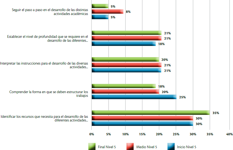 De igual forma (Figura 4), se destaca como el factor de mayor afectación el identificar los recursos que necesita para el desarrollo de las diferentes actividades académicas -30% en el ciclo inicial y medio-. En este sentido, los estudiantes virtuales no solamente deben ser capaces de determinar, en cada actividad o tarea, los recursos cognitivos de que deben disponer, sino también seleccionar las estrategias de aprendizaje para su desarrollo y determinar el tiempo que puede llegar a requerir la realización de la tarea. Adicionalmente, la complejidad de las tareas aumenta con respecto al avance en el proceso formativo, quizás ésta es una de las razones por las cuales, en el ciclo final, se incrementa levemente el número de estudiantes (35%), que le otorga el máximo nivel de importancia.