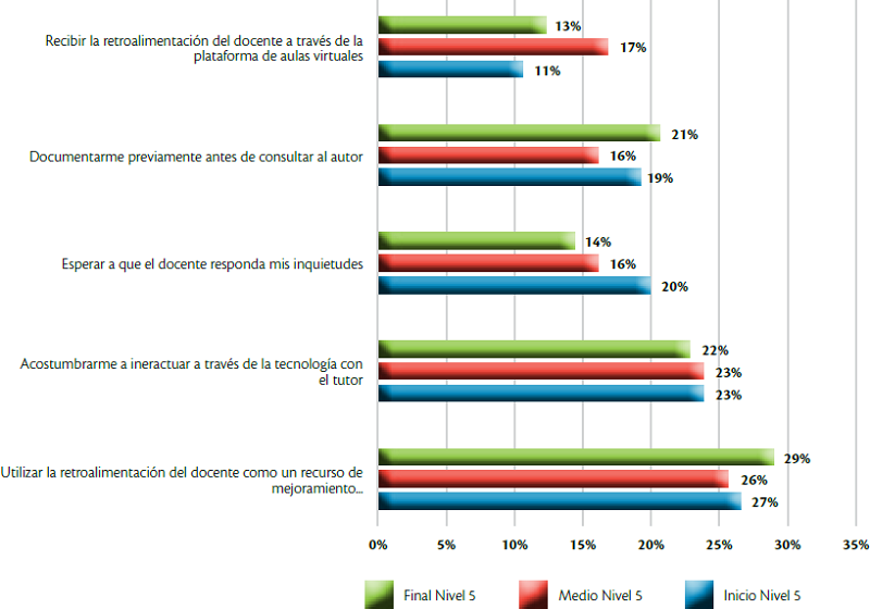 Lo anterior se relaciona con el hecho de que los estudiantes virtuales señalan que les cuesta trabajo acostumbrarse a interactuar a través de la tecnología con el tutor, 22% en los tres ciclos. Se esperaría que al menos los estudiantes del ciclo final de formación hubiesen cambiado su perspectiva sobre este aspecto, sin embargo, no fue así. Aunque esto sí explica porqué les genera dificultad recibir la retroalimentación a través del aula virtual (Figura 6).