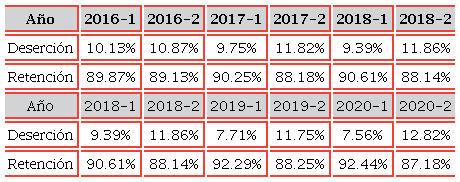 Ministerio de Educación Nacional (MEN) (2015-2020), Sistema para la Prevención de la Deserción de la Educación superior. Estadísticas de deserción estudiantil, <https://www.mineducacion.gov.co/sistemasdeinformacion/1735/w3-article-212299.html?_noredirect=1> [Consulta: marzo 2022].