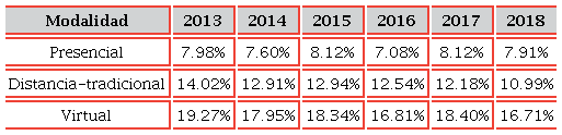 Bajo esta perspectiva, uno de los principales retos que se enfrentan en la modalidad virtual desde las IES, los docentes y los propios estudiantes, es evitar la deserción que, en la modalidad virtual -y en lo que se conoce en Colombia como distancia tradicional-, es superior a la de la educación presencial (Tablas 1 y 2). Este abandono de parte de los estudiantes, se debe en parte a que el estudiante virtual tiene que realizar un mayor esfuerzo para adaptarse a la metodología de la modalidad que seleccionó para desarrollar su proceso formativo; se entiende que adaptarse implica “acomodarse, avenirse, a diversas circunstancias y condiciones […] desempeñar funciones distintas” (RAE, 2021a), para las cuales se está preparado y que son muy distintas a la experiencia de la educación presencial que él conoce.