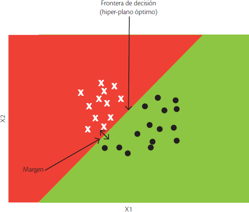 Una SVM encuentra el hiperplano óptimo al separar los datos con la clase +1 de los datos con la clase -1. La distancia entre el hiperplano y los datos de entrenamiento más cercanos al hiperplano se llama margen. La Figura 1 muestra un ejemplo sintético muy simple de un problema linealmente separable (LSP), usado para mostrar el margen.