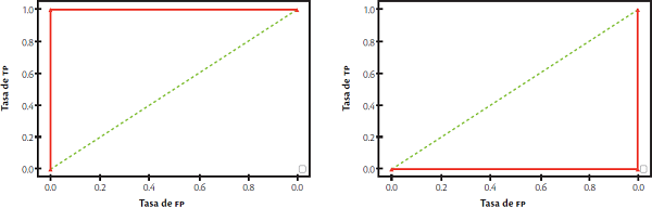 Por otro lado, una curva AUC (área bajo curva) -ROC (característica de operación del receptor)- mide cuánto puede diferenciar un modelo entre clases. Los valores de AUC varían de 0.0 (todas las predicciones son incorrectas) a 1.0 (100% de las predicciones son correctas). La Figura 3 muestra la curva ROC para el clasificador ideal (AUC = 1.0) y para el peor clasificador (AUC = 0.0).