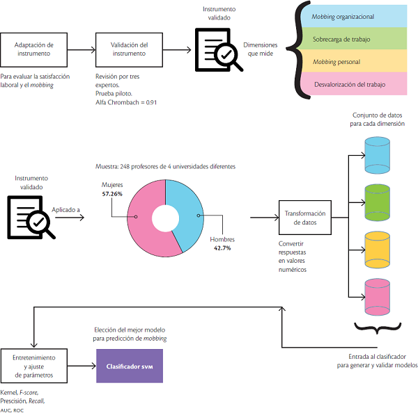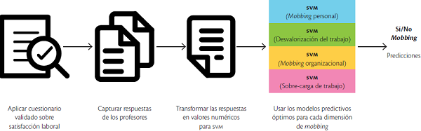 Por lo anterior, en esta investigación proponemos la identificación de acoso laboral en docentes de instituciones de nivel superior, mediante la aplicación de instrumentos que miden la satisfacción en el trabajo, en lugar de medir el nivel de mobbing explícitamente. Para este propósito, generamos cuatro modelos predictivos basados en máquinas de vectores soporte (SVM por sus siglas en inglés, Support Vector Machine). Estos modelos se crearon utilizando datos reales recopilados a través de un instrumento validado, que mide la satisfacción laboral y el mobbing. Se eligió usar SVM porque es uno de los modelos más precisos para la predicción (clasificación), utilizado en diferentes aplicaciones. Las SVM no intentan explicar las relaciones entre las variables, sino que su propósito es realizar predicciones con la mayor exactitud posible, basándose únicamente en los datos usados para ajustar el modelo predictor.