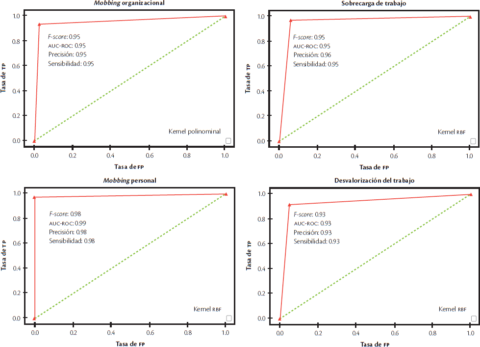 La Figura 6 muestra un resumen de los desempeños de las SVM para predicción de acoso laboral, calculado mediante validación de 10 cruces. La precisión es mayor que 0.93 para todas las dimensiones. El peor valor de la recuperación es 0.93, mientras que su mejor valor es 0.98. El valor F-score está entre 0.93 y 0.98. Finalmente, el mejor valor de AUC es 0.99 y su peor valor es 0.93. Con base en estos resultados, es posible afirmar que estos modelos son mejores a los encontrados en la literatura, y que son precisos para la predicción de acoso laboral para la muestra de nuestro estudio.