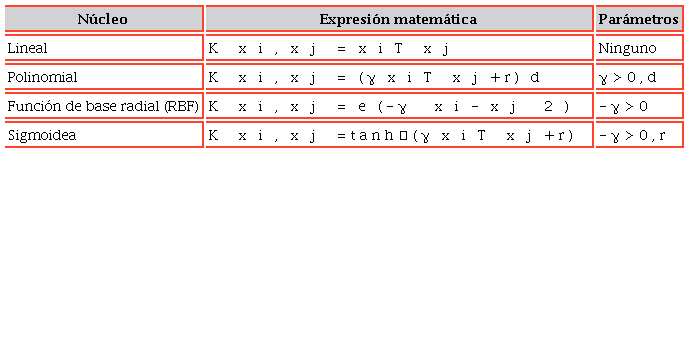 Los núcleos son funciones que satisfacen algunas propiedades matemáticas, como las condiciones de Mercer. La Tabla 1 muestra las funciones más comúnmente utilizadas como núcleos.